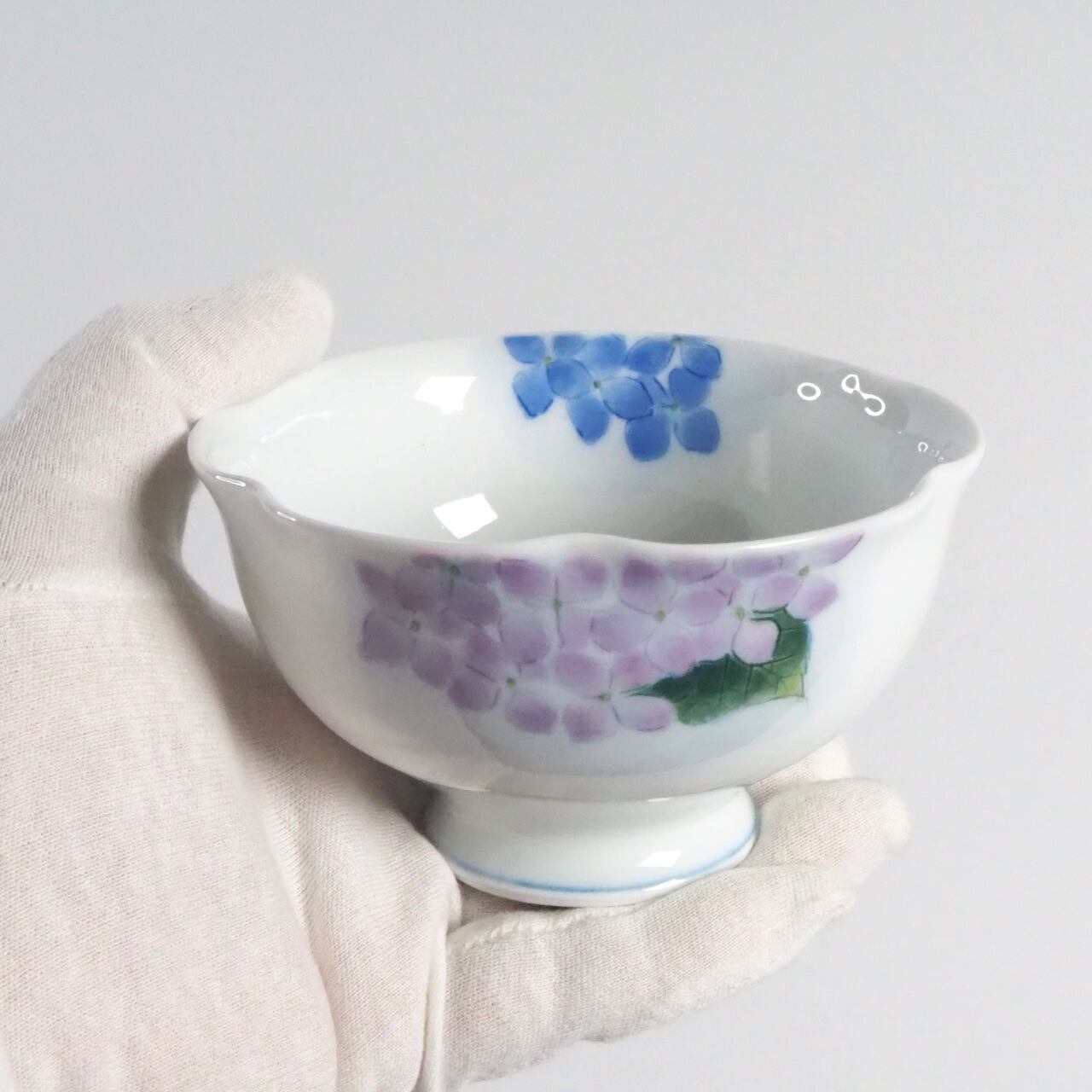 花が咲いたような形の高台小鉢です。シンプルに紫陽花を描きました。